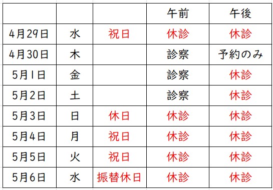 今年の大型連休期間中は、下記表の通りの診療とさせて頂きます。